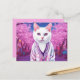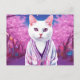 Postal con arte de fantasía divertida, un gatito en un elegante cardigan entre los cerezos floridos. Excelente para todo aquel que ame las gatitas modernas y el humor y el sakura, tema primaveral.