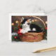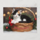 Una tarjeta postal de Navidades adorables que hará sonreír a cualquiera. Bonito de gatitos sentados en una canasta de mimbre cubierta en un jardín de vacaciones. Envíe uno a sus amigos esta temporada.