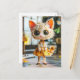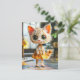 Ilustracion de un lindo gatito chica con falda y blusa amarillas, parado en una habitación luminosa. Ideal para el arte infantil, los temas de moda y la decoración.