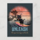 Postales de vacaciones de gatos con Wave-Riding Sunset: Un gato negro surfeando sobre una ola, con el sol en tonos rosa y naranja, creando una escena caprichosa y surrealista.