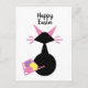 Gato Kitty Retro Whimsical Gráfico Feliz Postales De Pascua. Sencillo gatito semi abstracto negro y rosa de Pascua con cola envolviendo los coloridos huevos de Pascua como canasta. La letra con letras a mano dice "Feliz Pascua". Opción para cambiar, borrar o conservar texto. Diseño de la cabeza a mediados de siglo moderno mcm. Step by Step Inspiration Series disponible exclusivamente en Zazzle en zazzle.com/store/KrisHarty, diseñado por el diseñador internacional Kris Harty. © 2020 Diseños Inspiradores paso a paso de Kris Harty