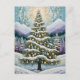 Esta majestuosa obra de arte representa un bello árbol de Navidad decorado contra un sereno paisaje montañoso cubierto de nieve. El árbol está lleno de nieve y adornado con adornos dorados y azul pastel. El fondo está formado por unas montañas estilizadas y nevadas y un bosque denso, todo ello representado en una armoniosa paleta de blues, púrpura y verduras. Un sol radiante o estallido estelar corona la escena con un brillante patrón de oro y blanco al estilo de mosaico, dándole a la pieza una cualidad rica, decorativa y espiritual.