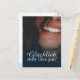 ¡Glücklich steht Dir gut! Kompliment Karte mit lachendem Frauengesicht und handschriftlichen Grüßen auf der Vorderseite der Karte. Restliche Flächen stehen zur freien Verfügung.