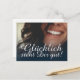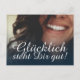 ¡Glücklich steht Dir gut! Kompliment Karte mit lachendem Frauengesicht und handschriftlichen Grüßen auf der Vorderseite der Karte. Restliche Flächen stehen zur freien Verfügung.