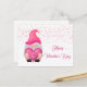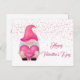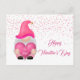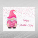 Un gnomo rosado sostiene un corazón rosado diciendo "Sé mío" con corazones de plata y confeti.