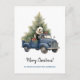 Gracioso Panda en postal Blue Retro Van Xmas. Dibujo acuarela de un lindo oso panda blanco en un camión vintage azul y árbol de Navidad. Texto personalizado.