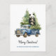 Gracioso Panda en postal Blue Vintage Van Xmas. Dibujo acuarela de un lindo oso panda blanco en un camión vintage azul y árbol de Navidad. Texto personalizado.