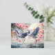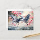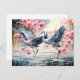 Dos elegantes grúas se paran en aguas poco profundas rodeadas de flores florecientes y reflejos reflejados. Las obras de arte cuentan con suaves pinceles y un entorno natural tranquilo.