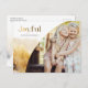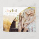 Moda, diseño moderno de vacaciones con elegante escritura personalizado "Joyful" en un estilo de gradiente dorado con una plantilla única de fotos curvada y sutiles acuarelas doradas estilo paisaje invernal. Atrás incluye gráficos complementarios y campos de texto adicionales.