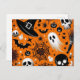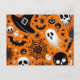 Un fondo de color naranja con fantasmas, cráneos, murciélagos y bombeos aterradores