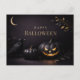 A refined, luxury-inspired design that transforms classic Halloween symbolism into a couture card. Set against a rich matte black and deep midnight backdrop, sleek black pumpkins glow subtly with warm golden light, accompanied by a poised raven and a delicate crescent moon. Gold typography reading “Happy Halloween” is centered with confident spacing, creating an elegant focal point that feels dramatic yet restrained.