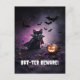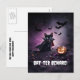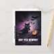 Una postal divertida para Halloween. Un gatito gatito vestido de vampiro espeluznante con murciélagos por todas partes. Una manera divertida de enviar un lindo saludo humorístico para la festividad.