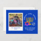 Stylish, elegant family photo postcard to celebrate HANUKKAH. Design shows a gold colored MENORAH with multicolored STAR OF DAVID and silver gray DREIDEL. At the top there is curved text which says BARUCH ATAH, ADONAI (Blessed are You, O God) and underneath the text reads HANUKKAH BLESSINGS FROM OUR HOME TO YOURS. On the reverse, there is a placeholder message, surrounded with a gold colored border. ALL TEXT IS CUSTOMIZABLE, so you can personalize with your own choice of greeting and text. With customization, eg. 'from our business to yours', this would also make a great corporate greeting card. You can also upload a family photo. The main color is Israeli blue. Other versions of this card are available in the HANUKKAH Collection by Berean Designs.