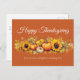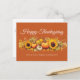 This orange company Thanksgiving postcard features a vintage drawing of a pumpkins patch with fall leaves and cute autumn sunflowers. Cute Happy Thanksgiving postcards with white script of your business name.