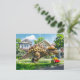 Un dinosaurio en un gorra de paja siembra el césped en un vecindario suburbano —la criatura prehistórica se encuentra con las tareas modernas.