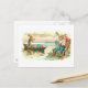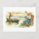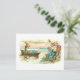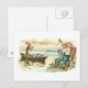 Un conejito de Pascua sale de la orilla de un lago en un bote de remos lleno de huevos de colores. Su amigo se sienta en la orilla, diciéndole adiós con un pañuelo blanco. Él sostiene una caña y tiene una canasta de huevos en la espalda. La inscripción dice "Heureuses Paqués", francés para la Pascua Feliz.