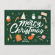 Disfrute del espíritu festivo con nuestra tarjeta postal navideña, una mezcla perfecta de alegría navideña y un diseño reconfortante. El fondo verde oscuro prepara el escenario para un maravilloso país invernal, adornado con brillantes letras a mano que deletrean "Feliz Navidad". Rodeada de encantadores íconos de invierno como regalos, un caldo, un muñeco de nieve, cacao caliente y adornos, esta carta captura la esencia del deleite de la temporada. El divertido detalle de cada elemento añade un toque de magia, convirtiéndolo en un regalo visual para el destinatario. Voltea al dorso de la tarjeta, y encontrarás un espacio generoso para un mensaje más largo, creando una conexión personal que va más allá de las palabras. Comparta sus deseos más cálidos con sus seres queridos usando la postal Merry Christmas Hand-Lettered, donde el arte festivo se encuentra con el sentimiento más sincero en cada detalle.