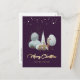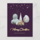 Postal de Navidades morados con una escena acuarela de invierno con un dólar y una paloma en un bosque nevado y estrellas brillantes encima de ellos sobre un fondo morado. Personalice fácilmente esta postal de Navidades púrpura de wateroclor con su nombre familiar, dirección de retorno y mensaje.