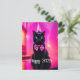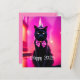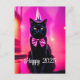 Postal festiva de Año Nuevo con vibrante arte de fantasía. Un elegante gato negro con un gorra puntiagudo y corbata de color púrpura luce un aspecto jazzy, y viene con el texto " Feliz 2024 " Canva AI fue utilizado por la diseñadora humana Alma Wad para producir esta imagen. Excelente para cualquiera a quien le gusten los colores psicodélicos, gatitos negros humorísticos y deseos de 2024.