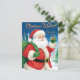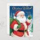 Envía el espíritu de los Navidades con este encantador ilustracion de estilo vintage de un alegre Santa Claus! Enfrentado a una noche azul y nevada, Santa lleva su gran saco verde de juguetes y sostiene un pequeño regalo perfectamente envuelto. La tarjeta contiene el cálido saludo, "Navidades Deseos Especialmente para Ti". Este diseño captura la magia tradicional y reconfortante de la temporada y es perfecto para enviar saludos a la familia, amigos y a todo aquel que ame imágenes clásicas de vacaciones.