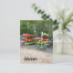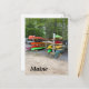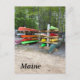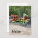 Kayaks coloridos sobre un mueble de madera en un entorno arbolado en la región de los lagos de Maine