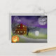 Esta imagen es una imagen de una casa embrujada y un patio lleno de una espuma espeluznante y espeluznante. Una luna llena domina la casa. Los árboles muertos con una lápida y calabaza dan al paisaje. En la parte trasera de la postal hay una opaca negra que la hace un poco más espeluznante. Envíe esta postal durante las vacaciones.