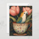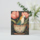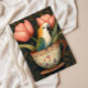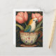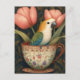 Un ilustracion encantador de un loro colorido sentado en un vaso de agua floral, enmarcado por tulipanes rosas suaves. Perfecto para los amantes de las aves, los amantes de las flores y los coleccionistas de cartas de arte únicas.