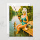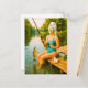 Postal Festiva Mujer en la pesca de Bikini con pollos de madera