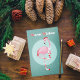 Flamingo rosa dulce y gracioso con pañuelo de medias a rayas y ilustracion de color pastel con sombrero Santa y rosa y menta. Las letras a rayas complementan este diseño