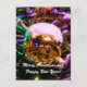 Árbol de Navidad y bola de adorno amarillo cubierta de nieve fresca. Luz colorida alrededor. Humor alegre y alegre. Envía Feliz Navidad y Feliz Año Nuevo. Postal vertical. Puede cambiar o eliminar la imagen y el texto.