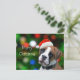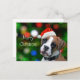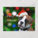 Fawn y el perro boxeador blanco usa un sombrero de Santa muy pequeño y se ve lindo con Navidades brillantes luces en el fondo amantes de los perros Navidades postal de vacaciones
