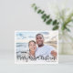 Comparte tu foto favorita de las vacaciones en la playa con esta divertida y moderna tarjeta de fotos navideña con una moderna tipografía escrita a mano que dice "Navidades de la playa de los cerezos" decorada con olas, sol y ilustraciones de surf. Fácilmente personalizable con una de sus fotos favoritas de vacaciones y sus nombres. La parte posterior de la tarjeta presenta un patrón de onda en azul y blanco.