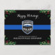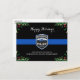 Envía saludos navideños felices a amigos, empresarios, compañeros de los departamentos de aplicación de la ley y a tu comunidad con esta tarjeta única de Navidades del Departamento de Policía de la Línea Azul - Negro y azul moderno con hojas y bayas huecas. Personaliza con el logo, mensaje y departamento del departamento de policía . DERECHOS RESERVADOS © 2020 Judy Burrows, Black Dog Art - Todos los derechos reservados. Tarjeta postal de vacaciones para Navidades del Departamento de Policía de la Línea Azul delgada