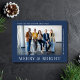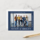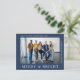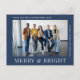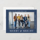 Postal de vacaciones de Navidades corporativos de color azul moderno que incluye una foto de su equipo de negocios y "Merry & Bright" en una tipografía blanca elegante. Personalice el nombre de su empresa y el mensaje de agradecimiento cliente/cliente en una tipografía blanca simple. Al revés, añádase otro mensaje personalizado de gratitud.