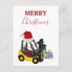 Un lindo ilustracion de un camión elevador de horquilla amarillo con sombrero de Papá Noel y decorado con luces de Navidad con palabras "Feliz Navidad". El ascensor festivo lleva regalos y regalos a los Navidades. Ideal para los amantes de los camiones de transporte de todas las edades. Una postal ideal para Navidades para los entusiastas de los camiones carreteros grandes o pequeños, chicas o niños.