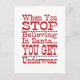 Añade algo de diversión a tu lista de tarjetas de Navidades de vacaciones esta temporada con este divertido diseño de vacaciones que incluye las palabras "Cuando DEJES de creer en Santa... USTED LLEGA ropa interior" en tipografía roja y caprichosa en el frente con su propio saludo de vacaciones y nombres familiares en la parte trasera. Personalizar este diseño único y único con su propia información personal familiar. Toda la redacción puede cambiarse a lo que quiera, y también a los tipos de letra y los colores de fuente. Para personalizar, haga clic en "Personalizar esta plantilla" y agregue su propia información. Si necesita ayuda para la personalización, por favor envíeme un correo electrónico a ybnormalone @gmail.com. Gracias por pasar por aquí. www.zazzle.com/YBNormal1.