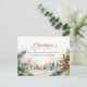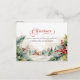 Este bonito diseño presenta un gráfico de texto de caligrafía "Navidades" personalizado y un verso de Navidades sentidos sobre un fondo de color agua, incluyendo un apacible paisaje cubierto de nieve con cabañas, pino y holly. La parte posterior incluye campos de texto adicionales para su mensaje y personalización.
