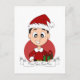 Diseño personalizado con el ilustracion de un lindo sonriente y feliz muchacho con pelo negro, el niño está usando un disfraz de Santa Cláusula con gorra rojo y sosteniendo un regalo; en círculo rojo sobre fondo blanco; con plantilla de texto de personalizable para tu nombre o mensaje