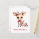 Navidades postales con el ilustracion de un adorable venado. Ojos grandes orejas grandes con una cabeza grande y pequeñas cuerdas marrones. Con un gran arco rojo.