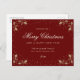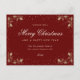Elegante postal de vacaciones rojas y doradas con nieve, hojalía y bayas en un fondo rojo. Personalice fácilmente esta postal de vacaciones en línea.