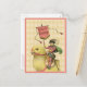 Un ilustracion vintage rediseñado de un niño en bicicleta y una chica gigante, con un cartel de Saludos de Pascua. Agregue una dirección de retorno y texto al reverso.