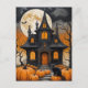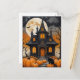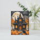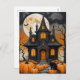 Una silueta espeluznante de una casa embrujada se alza contra una luna llena vibrante. Árboles desnudos y nudosos se extienden como dedos esqueléticos hacia el cielo, mientras que calabazas iluminadas puntean el patio. Un gato negro, un espíritu familiar de la temporada, se sienta en primer plano, sus ojos reflejando la luz inquietante. La obra de arte está dominada por una llamativa paleta de colores negra y naranja, perfecta para crear un ambiente clásico de Halloween.