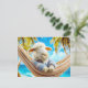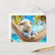 Una oveja lana descansando tranquilamente en una hamaca bajo palmeras tropicales, con un cielo azul de ensueño por encima. Un ilustracion humorístico y lúdico que mezcla las vibraciones vacacionales con la calma esponjosa de una oveja.