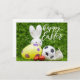 Postal Festiva Pascua de fútbol con pelota y conejo en hierba ver