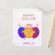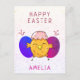 Cute Pascua Chick y Huevos Feliz Postales de Pascua. Patata con cáscara de huevo craqueada en la cabeza y un huevo azul y un morado de Pascua. Añade nuestro nombre y texto dentro de la tarjeta o borra.
