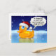 Un pato de goma en un gorra de Santa que congela en una charca helada del pato, con la nieve y los copos de nieve, esperando el invierno para ser pronto encima. El texto es adaptable y la burbuja del texto y el texto pueden ser quitados o ser substituidos.