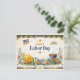 This warm and inviting Labor Day design celebrates the heart of everyday work with a friendly, vintage-inspired aesthetic. Set on a softly textured cream background, the message “Happy Labor Day” is surrounded by cheerful patriotic details, including an American flag, stars, and sunburst accents. At the center, a golden hard hat and a steaming backyard grill rest among abundant florals, symbolizing both dedication to work and the simple joys of well-earned leisure.