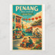 Travel poster featuring Penang, Malaysia, in a vibrant retro travel illustration style. Central scene showing George Town heritage shophouses with colorful facades, street art murals, and traditional Chinese lanterns. Coastal elements with blue sea and warm tropical sky in the background. Blend of multicultural details: colonial architecture, temple rooftops, and local street food vibes. Retro color palette: turquoise blue, warm yellow, coral red, cream, muted green. Clean graphic shapes, subtle grain texture. Bold vintage typography: “PENANG – MALAYSIA” with smaller text “George Town”. Vertical 2:3 layout, high-resolution for print.