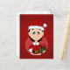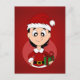 Diseño con un ilustracion de una linda y sonriente chica feliz con el pelo negro corto, lleva disfraz rojo y blanco de Santa Claus y tiene un regalo; Navidades diseño de vacaciones con fondo rojo