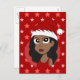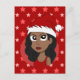Diseño con un ilustracion de hermosa joven afroamericana con cabello ondulado y el gorra de Santa Claus, Navidades diseño de vacaciones con un fondo rojo con estrellas, de Radka Kavalcova
